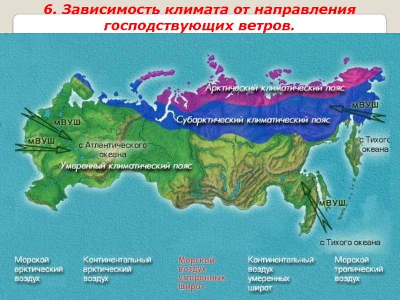 Слайд 326. Зависимость климата от направления господствующих ветров.