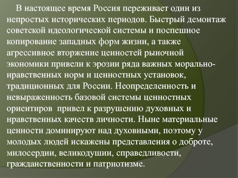 периодов. Быстрый демонтаж советской идеологической системы и поспешное копирование западных форм жизни, а также агрессивное вторжение ценностей рыночной экономики привели к эрозии ряда важных морально-нравственных норм и ценностных установок, традиционных для России. Неопределенность и невыраженность базовой системы ценностных ориентиров привел к разрушению духовных и нравственных качеств личности. Ныне материальные ценности доминируют над духовными, поэтому у молодых людей искажены представления ο доброте, милосердии, великодушии, справедливости, гражданственности и патриотизме.
