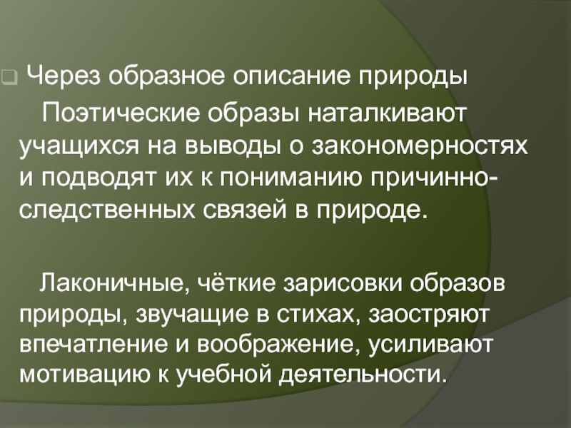 Лаконичные, чёткие зарисовки образов природы, звучащие в стихах, заостряют впечатление и воображение, усиливают мотивацию к учебной деятельности.
