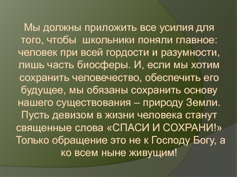 человек при всей гордости и разумности, лишь часть биосферы. И, если мы хотим сохранить человечество, обеспечить его будущее, мы обязаны сохранить основу нашего существования – природу Земли. Пусть девизом в жизни человека станут священные слова «СПАСИ И СОХРАНИ!» Только обращение это не к Господу Богу, а ко всем ныне живущим!