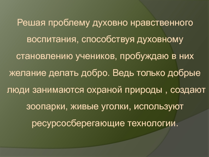 них желание делать добро. Ведь только добрые люди занимаются охраной природы , создают зоопарки, живые уголки, используют ресурсосберегающие технологии.