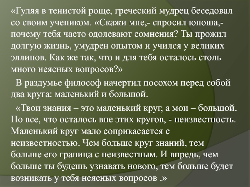 «Твои знания – это маленький круг, а мои – большой. Но все, что осталось вне этих кругов, - неизвестность. Маленький круг мало соприкасается с неизвестностью. Чем больше круг знаний, тем больше его граница с неизвестным. И впредь, чем больше ты будешь узнавать нового, тем больше будет возникать у тебя неясных вопросов .»