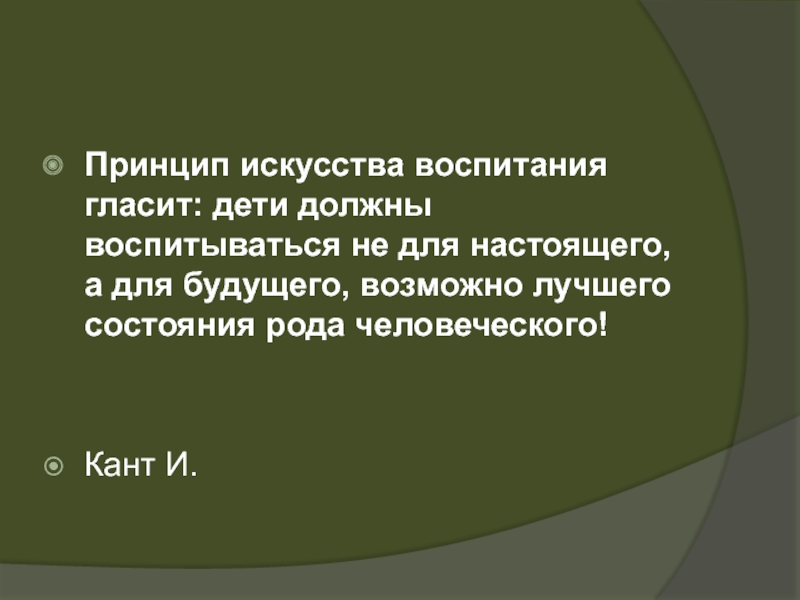 Слайд 24Принцип искусства воспитания гласит: дети должны воспитываться не для настоящего, а