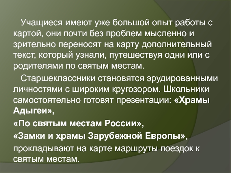 Старшеклассники становятся эрудированными личностями с широким кругозором. Школьники самостоятельно готовят презентации: «Храмы Адыгеи»,