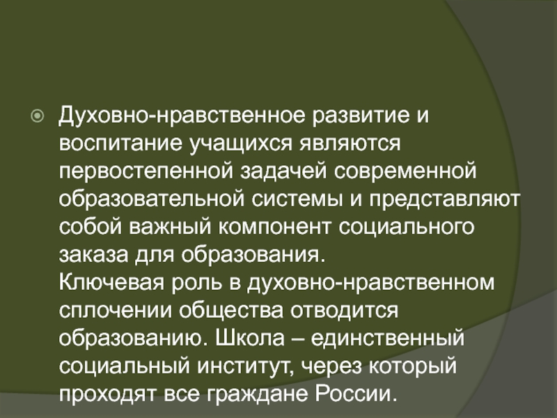 Ключевая роль в духовно-нравственном сплочении общества отводится образованию. Школа – единственный социальный институт, через который проходят все граждане России.