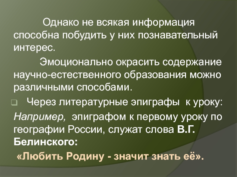 Например, эпиграфом к первому уроку по географии России, служат слова В.Г. Белинского: