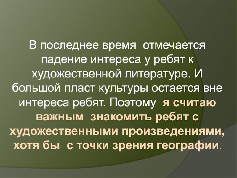 И большой пласт культуры остается вне интереса ребят. Поэтому я считаю важным знакомить ребят с художественными произведениями, хотя бы с точки зрения географии.