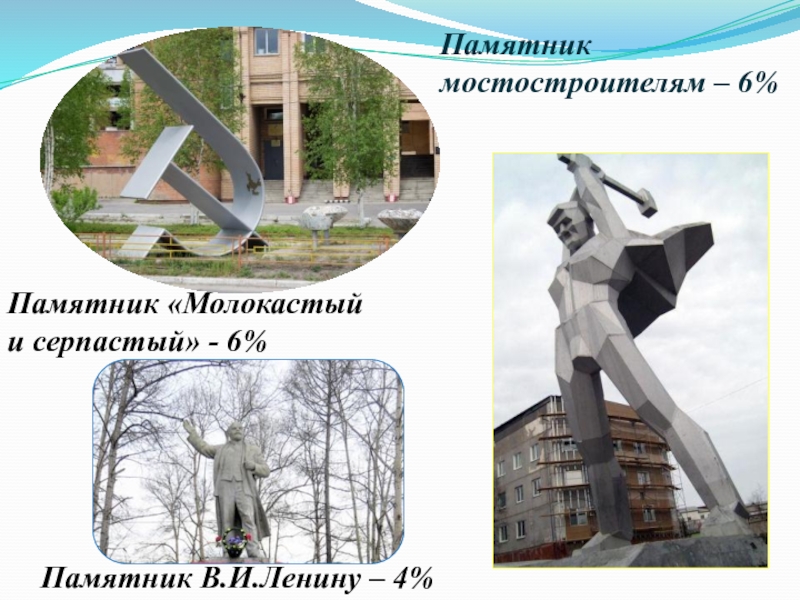 Памятник  мостостроителям – 6% Памятник «Молокастый и серпастый» - 6%Памятник В.И.Ленину – 4%