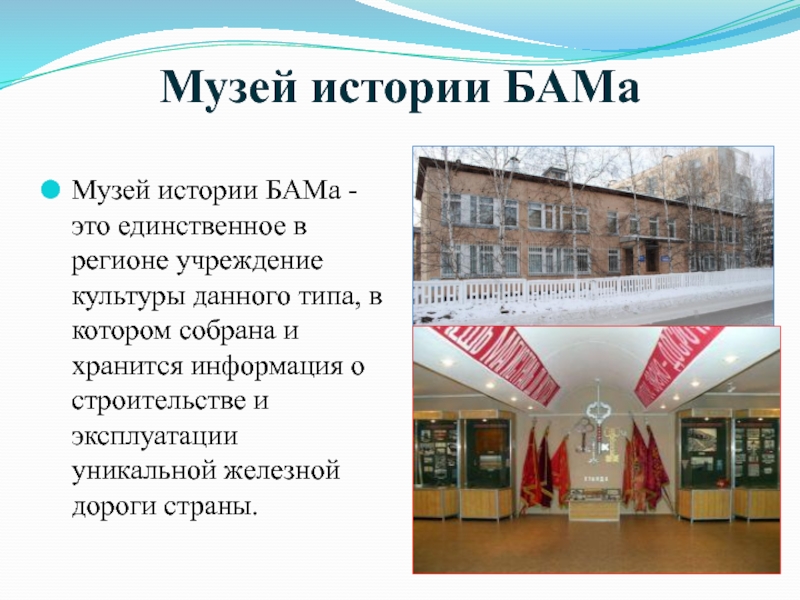 Музей истории БАМаМузей истории БАМа - это единственное в регионе учреждение культуры данного типа, в котором собрана
