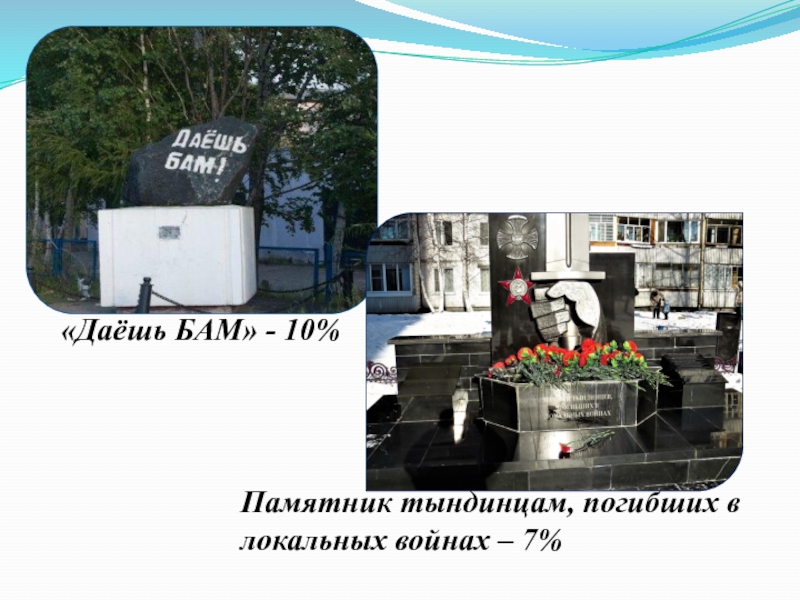 «Даёшь БАМ» - 10%Памятник тындинцам, погибших в локальных войнах – 7%