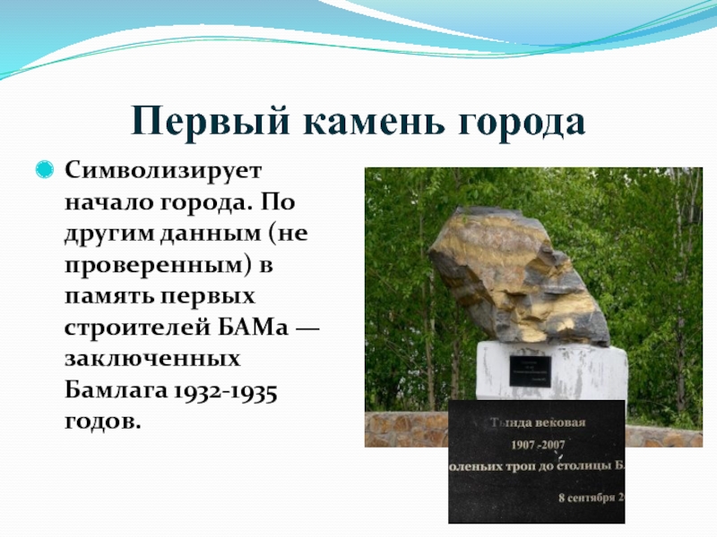 Первый камень городаСимволизирует начало города. По другим данным (не проверенным) в память первых строителей БАМа — заключенных