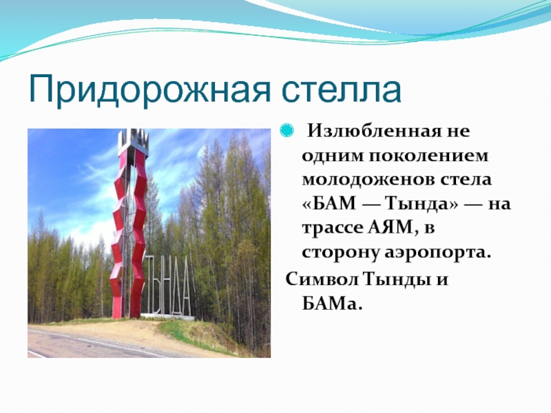 Придорожная стелла Излюбленная не одним поколением молодоженов стела «БАМ — Тында» — на трассе АЯМ, в сторону аэропорта.Символ