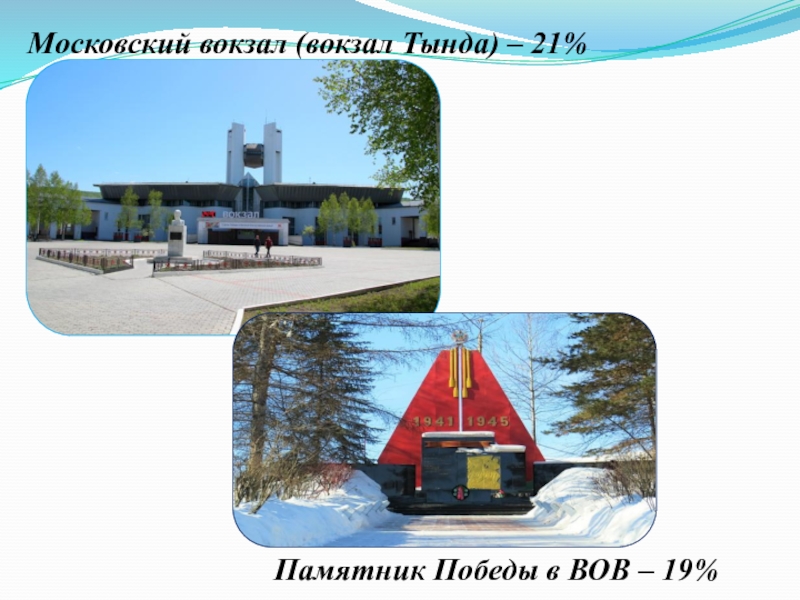 Московский вокзал (вокзал Тында) – 21%Памятник Победы в ВОВ – 19%