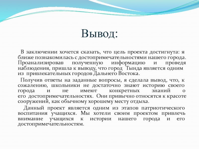 Вывод:  В заключении хочется сказать, что цель проекта достигнута: я ближе познакомилась с достопримечательностями нашего города.