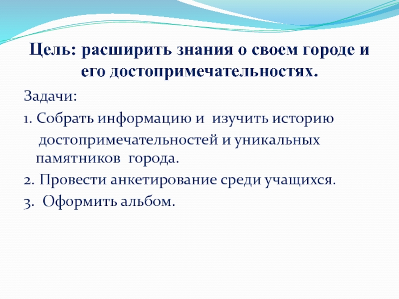 Цель: расширить знания о своем городе и его достопримечательностях.Задачи: 1. Собрать информацию и изучить историю достопримечательностей и уникальных памятников города.2. Провести анкетирование среди учащихся. 3. Оформить альбом.