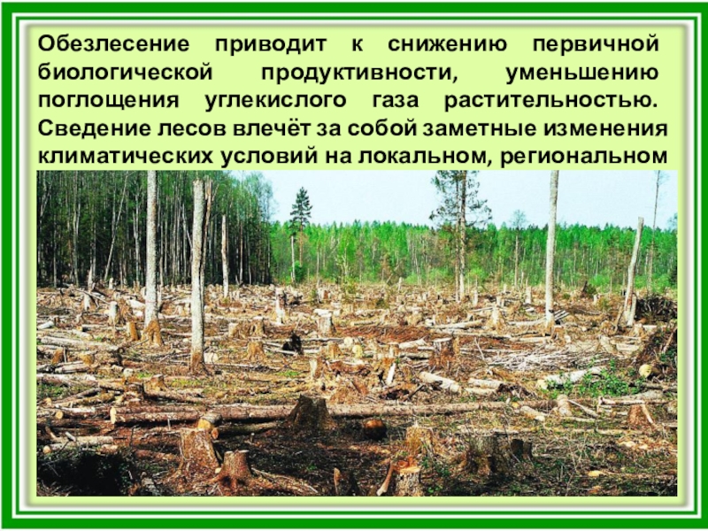 Слайд 28Обезлесение приводит к снижению первичной биологической продуктивности, уменьшению поглощения углекислого газа