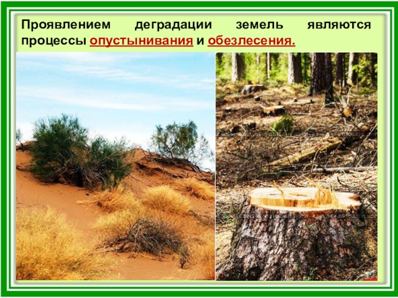 Слайд 18Проявлением деградации земель являются процессы опустынивания и обезлесения.