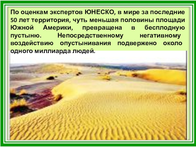 чуть меньшая половины площади Южной Америки, превращена в бесплодную пустыню. Непосредственному негативному воздействию опустынивания подвержено около одного миллиарда людей.