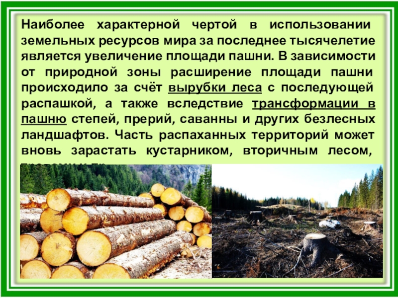 Слайд 16Наиболее характерной чертой в использовании земельных ресурсов мира за последнее тысячелетие