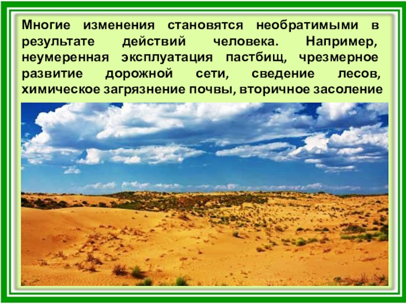 Слайд 21Многие изменения становятся необратимыми в результате действий человека. Например, неумеренная эксплуатация