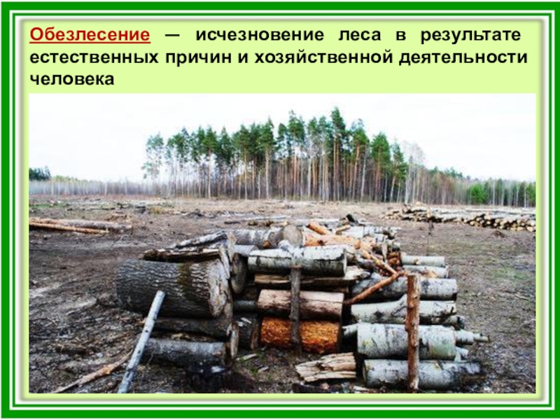 Слайд 26Обезлесение — исчезновение леса в результате естественных причин и хозяйственной деятельности