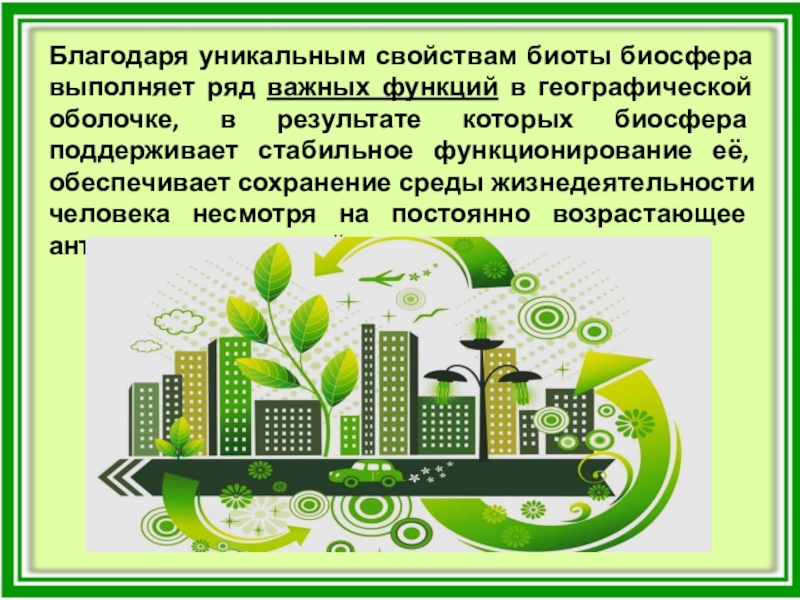 Слайд 5Благодаря уникальным свойствам биоты биосфера выполняет ряд важных функций в географической