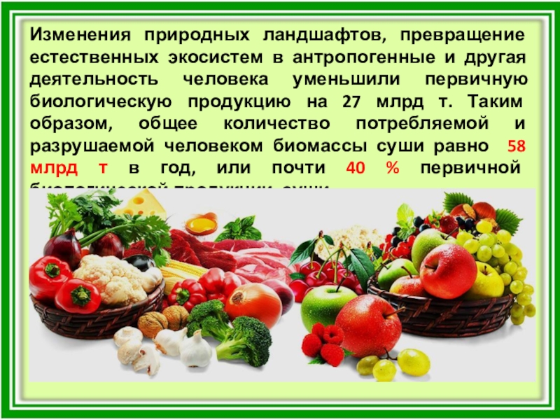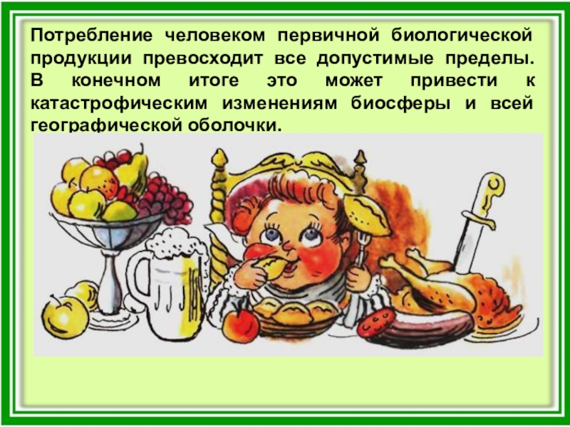Слайд 14Потребление человеком первичной биологической продукции превосходит все допустимые пределы.