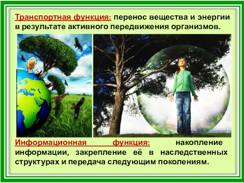 Слайд 9Транспортная функция: перенос вещества и энергии в результате активного передвижения организмов.