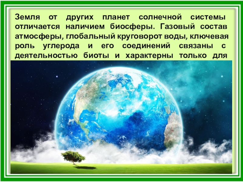 Слайд 3Земля от других планет солнечной системы отличается наличием биосферы. Газовый состав