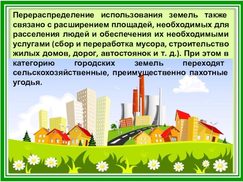 людей и обеспечения их необходимыми услугами (сбор и переработка мусора, строительство жилых домов, дорог, автостоянок и т. д.). При этом в категорию городских земель переходят сельскохозяйственные, преимущественно пахотные угодья.