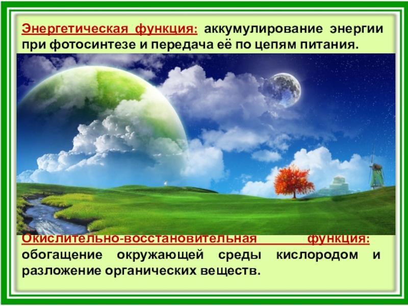 Слайд 6Энергетическая функция: аккумулирование энергии при фотосинтезе и передача её по цепям