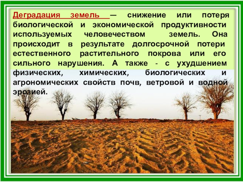 Слайд 15Деградация земель — снижение или потеря биологической и экономической продуктивности используемых