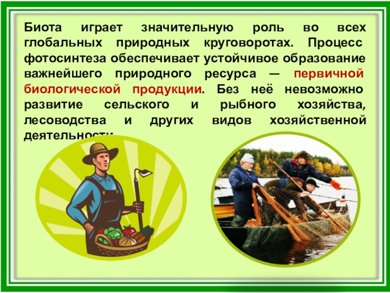обеспечивает устойчивое образование важнейшего природного ресурса — первичной биологической продукции. Без неё невозможно развитие сельского и рыбного хозяйства, лесоводства и других видов хозяйственной деятельности.