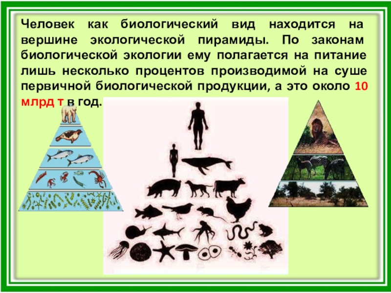 Слайд 11Человек как биологический вид находится на вершине экологической пирамиды. По законам