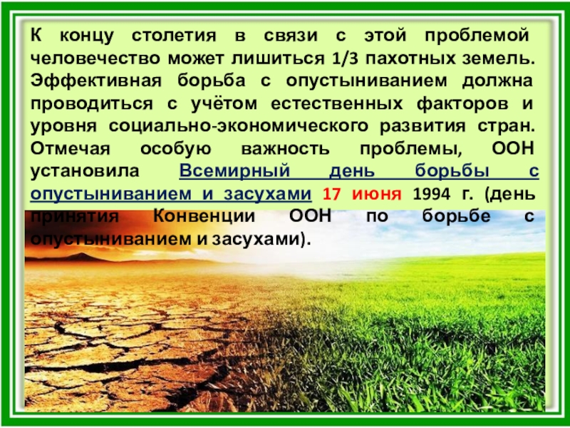 1/3 пахотных земель. Эффективная борьба с опустыниванием должна проводиться с учётом естественных факторов и уровня социально-экономического развития стран. Отмечая особую важность проблемы, ООН установила Всемирный день борьбы с опустыниванием и засухами 17 июня 1994 г. (день принятия Конвенции ООН по борьбе с опустыниванием и засухами).
