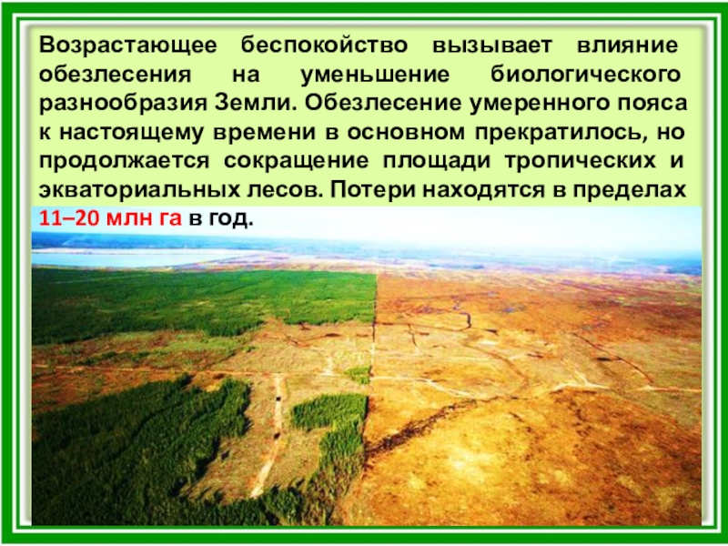 Слайд 29Возрастающее беспокойство вызывает влияние обезлесения на уменьшение биологического разнообразия Земли. Обезлесение