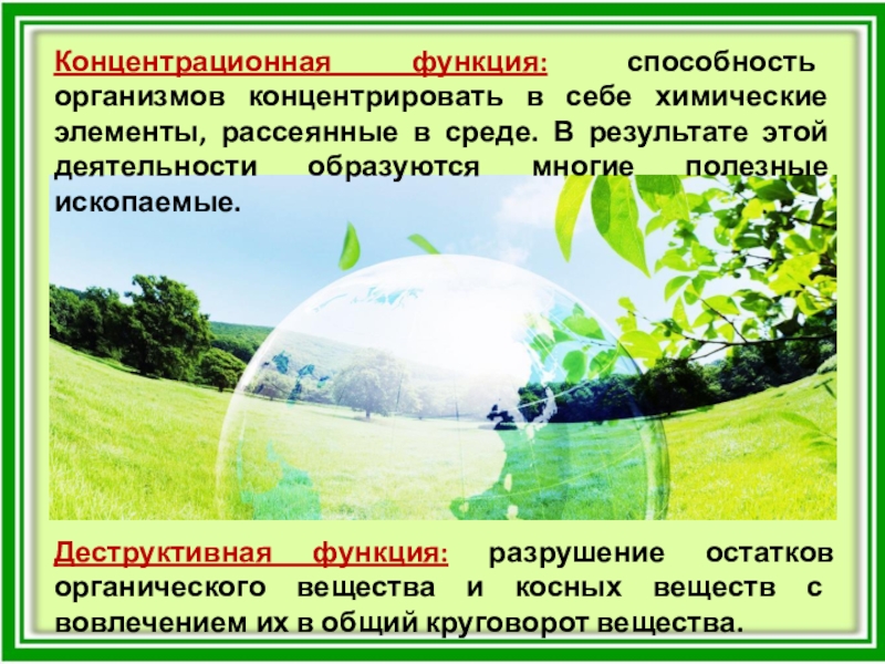 Слайд 8Концентрационная функция: способность организмов концентрировать в себе химические элементы, рассеянные в