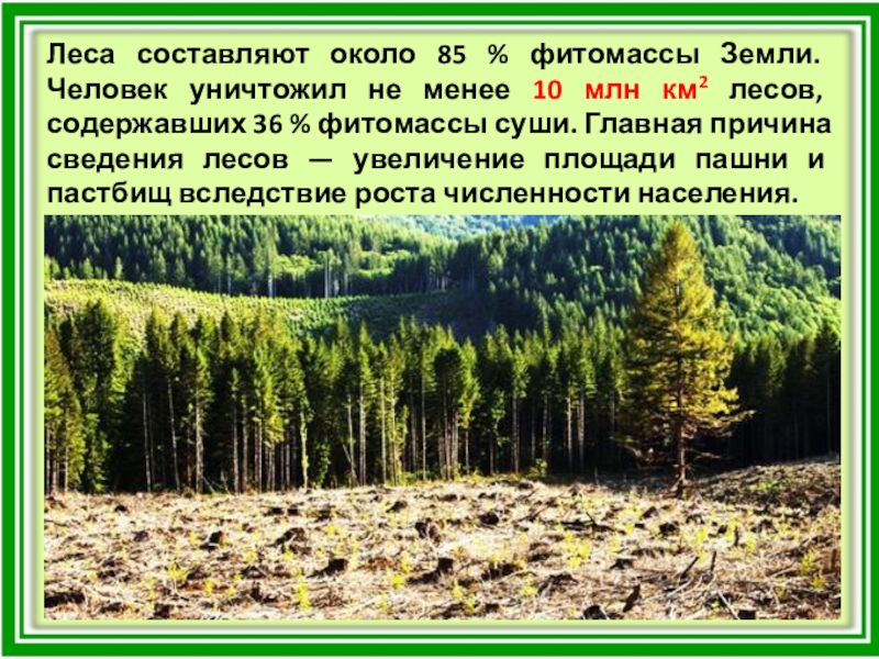 Слайд 27Леса составляют около 85 % фитомассы Земли. Человек уничтожил не менее