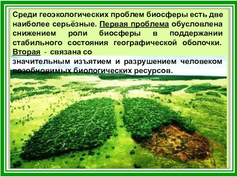 Слайд 10Среди геоэкологических проблем биосферы есть две наиболее серьёзные. Первая проблема обусловлена