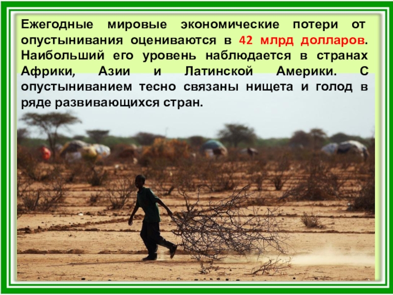 Слайд 24Ежегодные мировые экономические потери от опустынивания оцениваются в 42 млрд долларов.