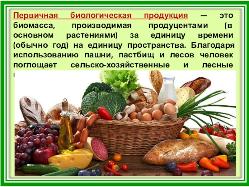 Слайд 12Первичная биологическая продукция — это биомасса, производимая продуцентами (в основном растениями)