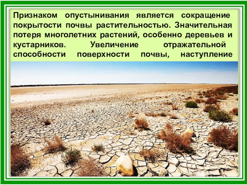 Слайд 20Признаком опустынивания является сокращение покрытости почвы растительностью. Значительная потеря многолетних растений,
