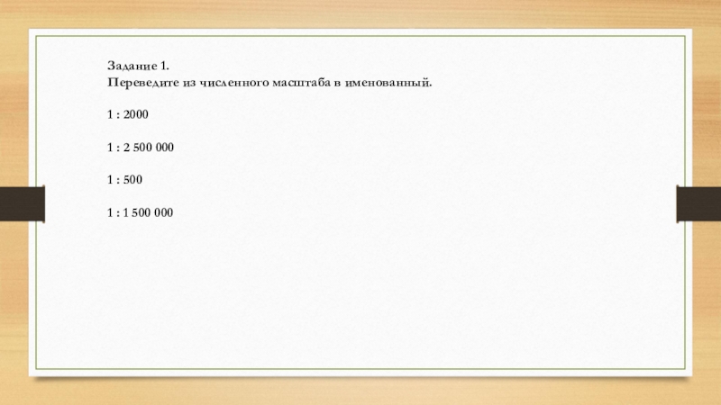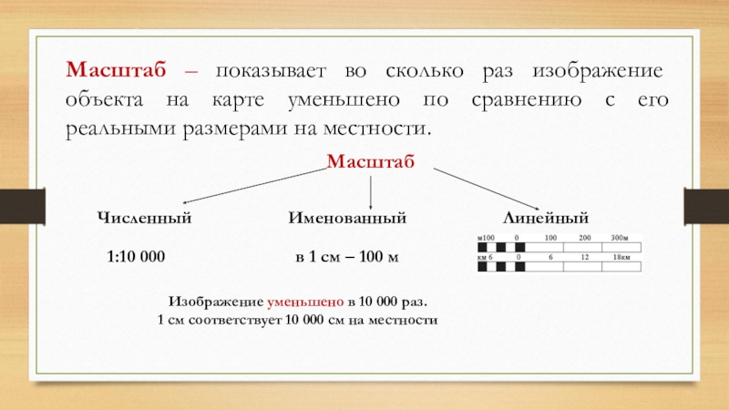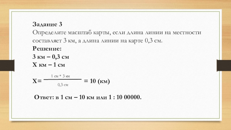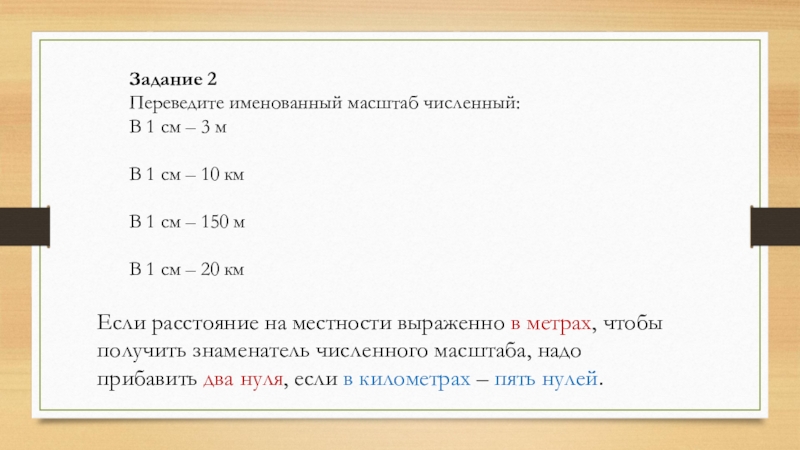 Если расстояние на местности выраженно в метрах, чтобы получить знаменатель численного масштаба, надо прибавить два нуля, если в километрах – пять нулей.