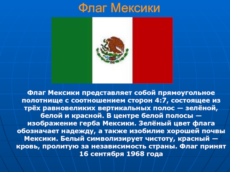 Флаг Мексики представляет собой прямоугольное полотнище с соотношением сторон 4:7,