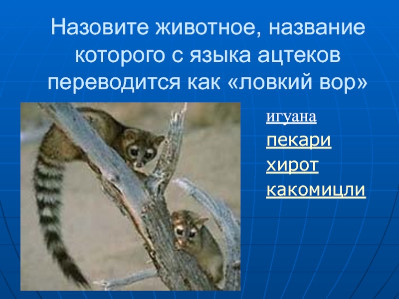 Слайд 48Назовите животное, название которого с языка ацтеков переводится как «ловкий вор»