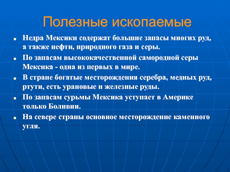Недра Мексики содержат большие запасы многих руд, а также нефти,