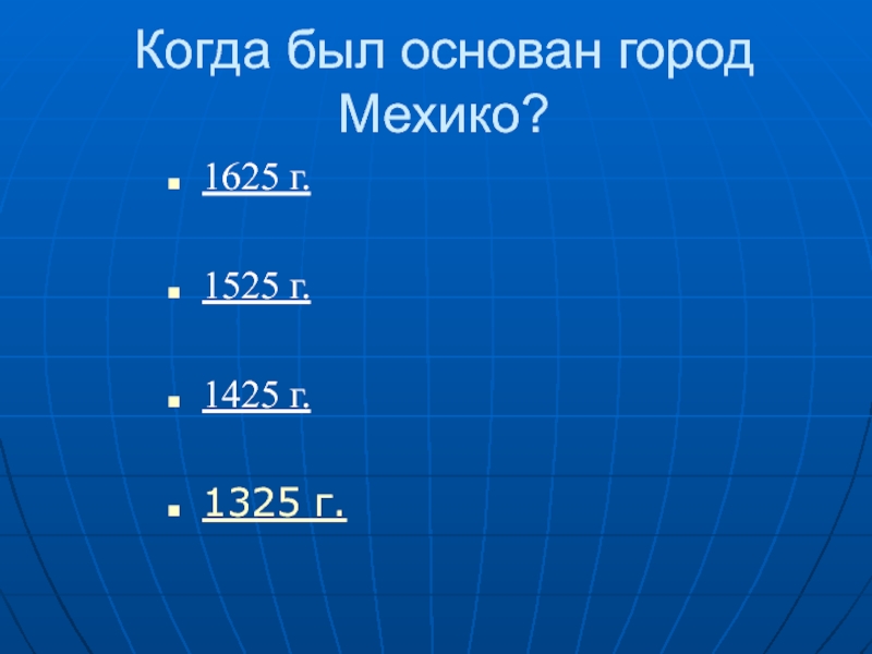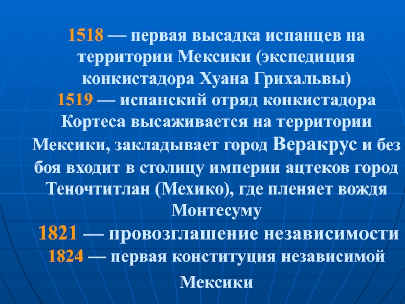 испанский отряд конкистадора Кортеса высаживается на территории Мексики, закладывает город Веракрус и без боя входит в столицу империи ацтеков город Теночтитлан (Мехико), где пленяет вождя Монтесуму
