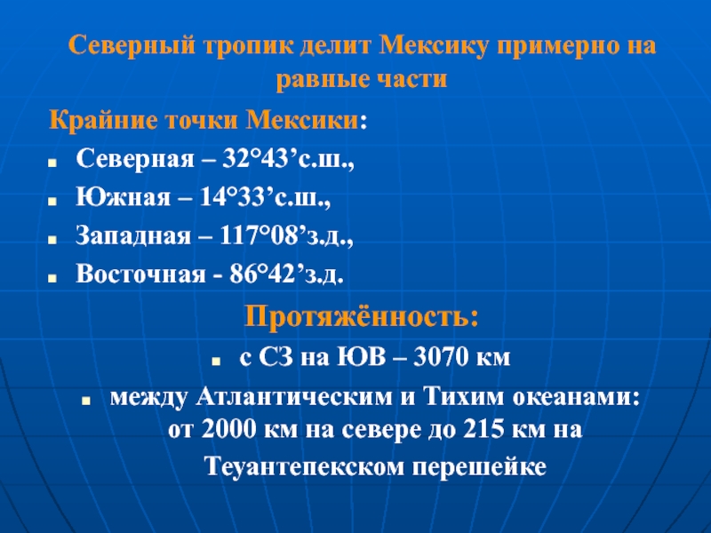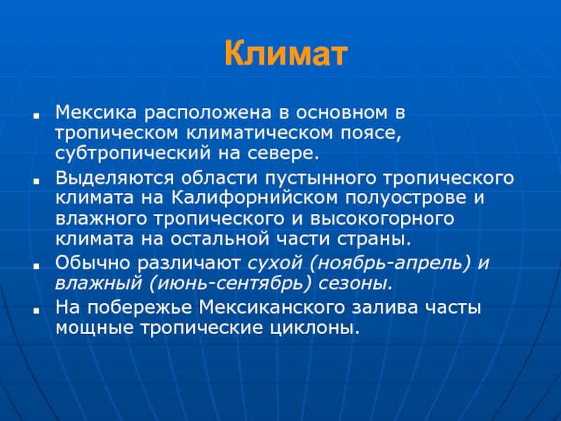 Мексика расположена в основном в тропическом климатическом поясе, субтропический на севере.