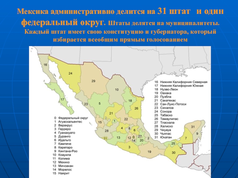Слайд 6Мексика административно делится на 31 штат и один федеральный округ.