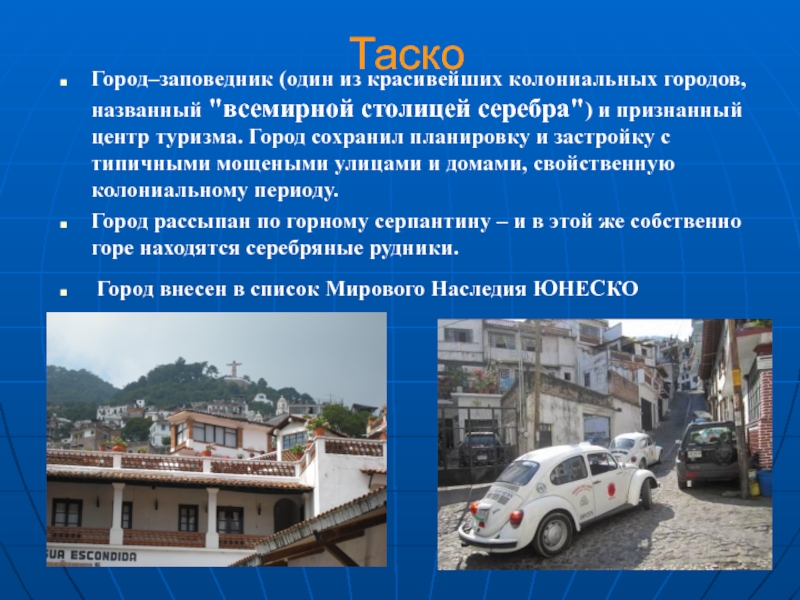Город–заповедник (один из красивейших колониальных городов, названный "всемирной столицей серебра")